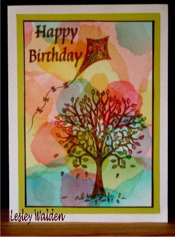 Stamp the Happy Birthday and mount on green card. I wish I had stamped the kite a bit further to the right but at the time I hadn't planned on the sentiment.